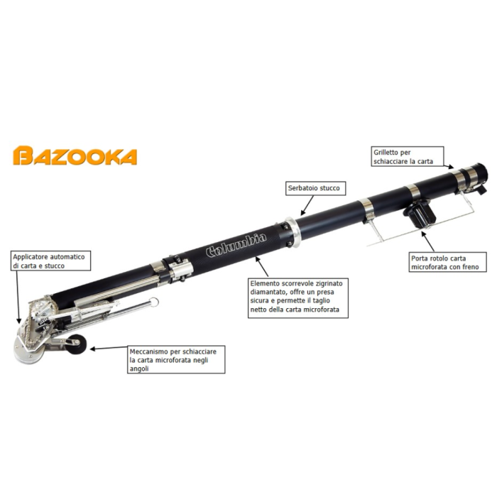 Caratteristiche: attrezzo composto da serbatoio stucco, porta rotolo carta microforata, sistema scorrevole taglio carta microforata, applicatore di stucco e carta microforata, pulsante per applicazione carta su angoli interni.