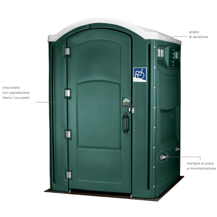 Il Bagno Mobile è costruito in polietilene (PE), è stabilizzato anti UV e 100% riciclabile. I Bagni Mobili vengono consegnati pronti all’uso.