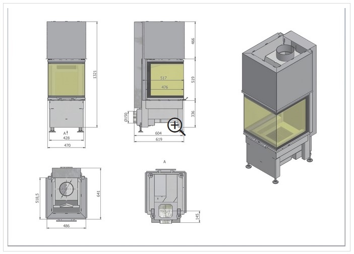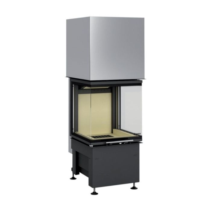 Caminetto a legna trifacciale a convezione naturale caratterizzato da un'ampia visione del fuoco.