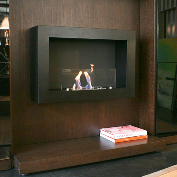 Biocamino da appendere a parete. Dotato di bruciatore rettangolare; capacità 2,5 litri; accendino, mano fredda, imbuto e staffa di fissaggio.