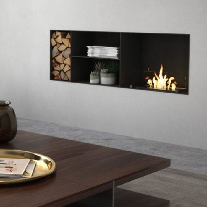 Biocaminetto da incasso con finitura minimale, colore nero opaco. Dotato di comodi spazi contenitivi, coniuga la piacevolezza della fiamma di un biocamino maisonFire con la praticità di un mobile da sala.