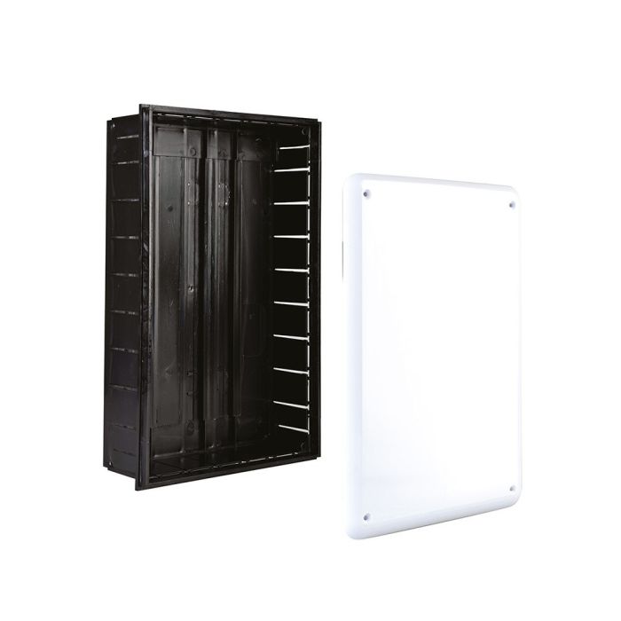 Cassetta per collettori completa di telaio, fondo e supporto per fissaggio di ogni tipo di collettori. Realizzata in plastica.