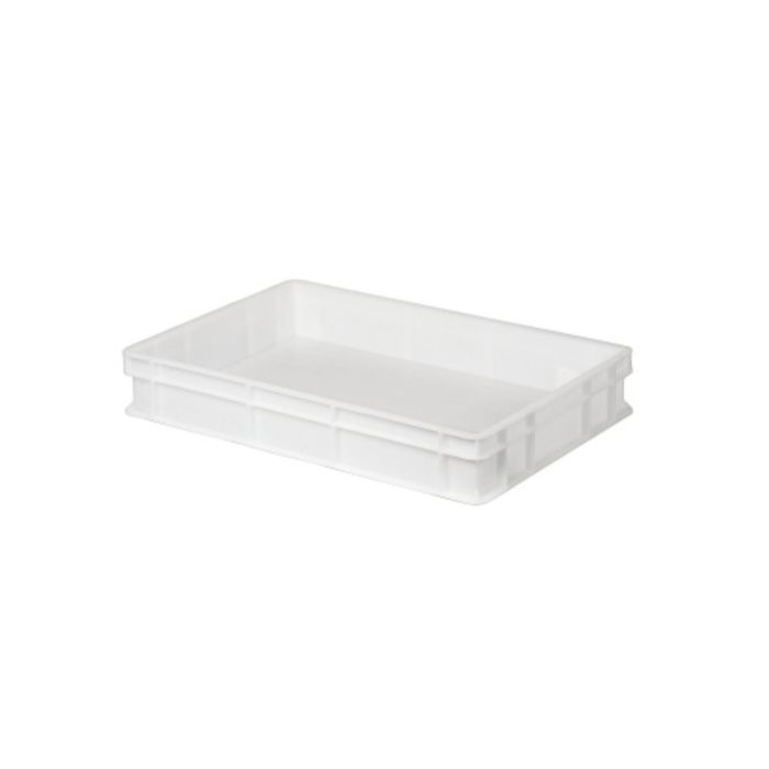 Robusta e pratica cassa in PEHD (Polietilene ad alta densità) di colore bianco neutro, sovrapponibile ed impilabile, con fondo e pareti piene.
