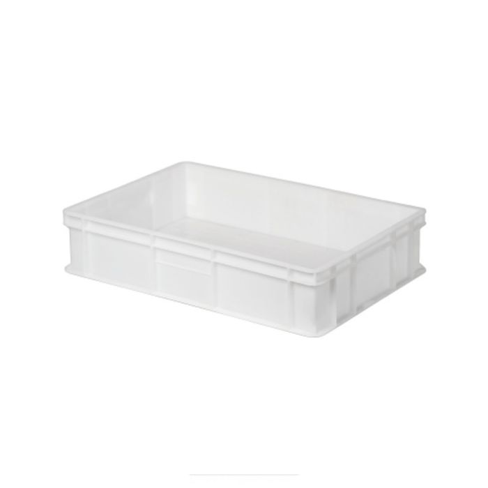 Robusta e pratica cassa in PEHD (Polietilene ad alta densità) di colore bianco neutro, sovrapponibile ed impilabile, con fondo e pareti piene.
