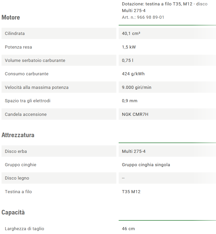 Fornito sia con testina a filo (T35) che disco per erba (Multi 275-4) e cinghia singola a rilascio rapido.