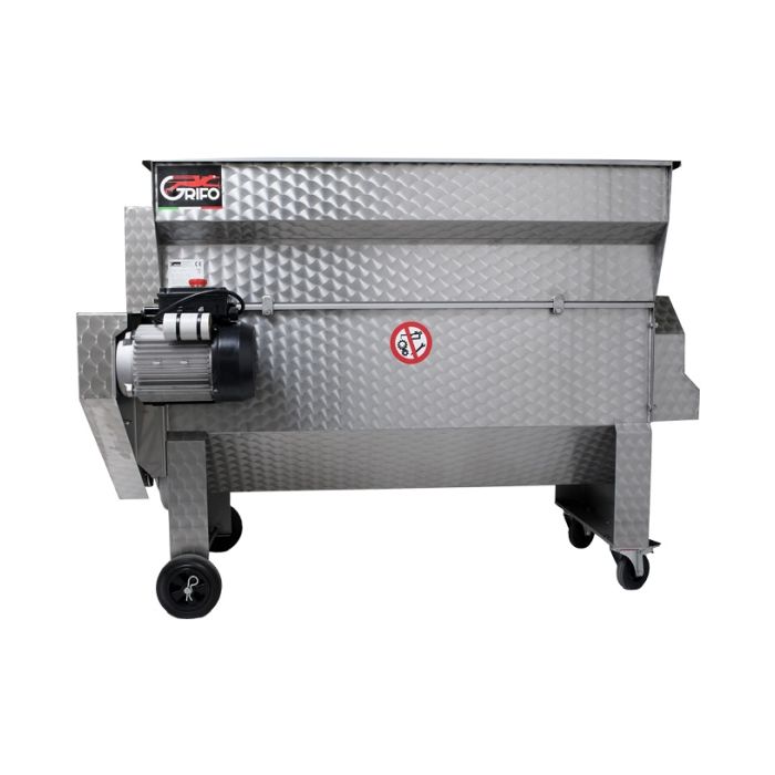 Dotata di una pompa di grandi dimensioni in acciaio Inox per il trasporto del mosto fino alla botte e di un potente motore elettrico che grazie a cinghie e ingranaggi aziona tutti i meccanismi quali la coclea superiore, l’albero diraspatore e la coclea inferiore per il trascinamento del pigiato alla pompa.