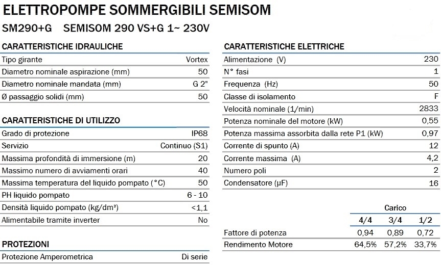 Descrizione / Elettropompa Fluidi 0,75 Hp BBC SEMISOM 290 VS+G 230V