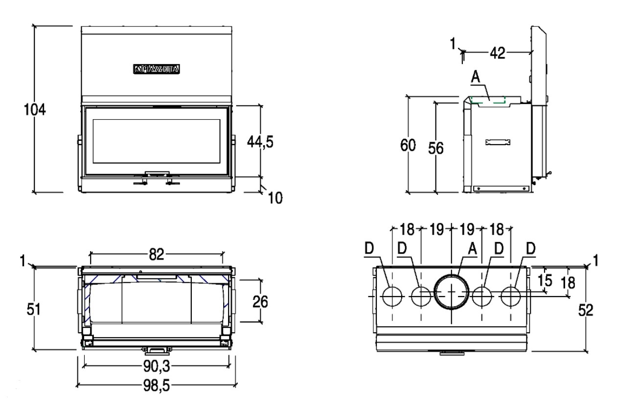 Descrizione / Inserto a Legna 12,2 Kw PIAZZETTA MC 90/44 SL Camino Con Anta Saliscendi