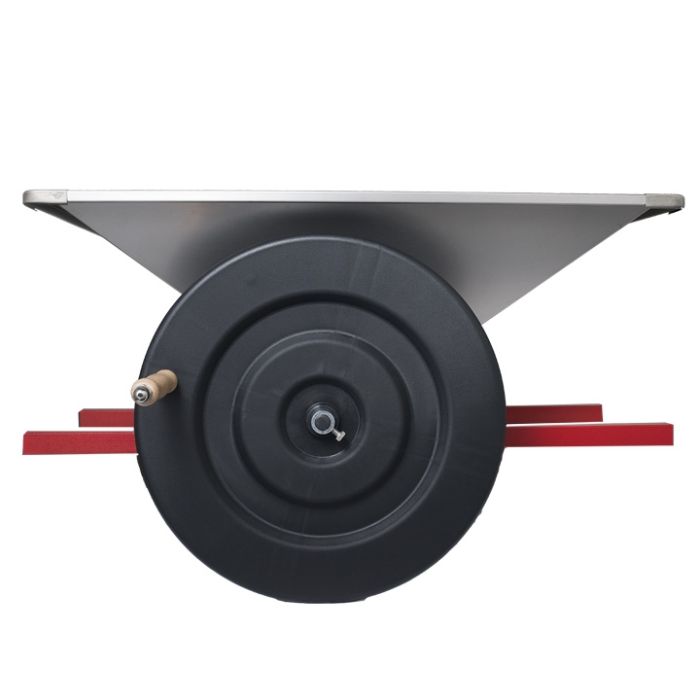 La macchina presenta una tramoggia in acciaio Inox e una barella in acciaio smaltato; grazie a un volano vengono azionati manualmente tutti i meccanismi interni: ingranaggi, agitatore dotato di una serie di coltelli per una rapida spezzettatura della frutta e rulli per una preliminare azione di schiacciamento.