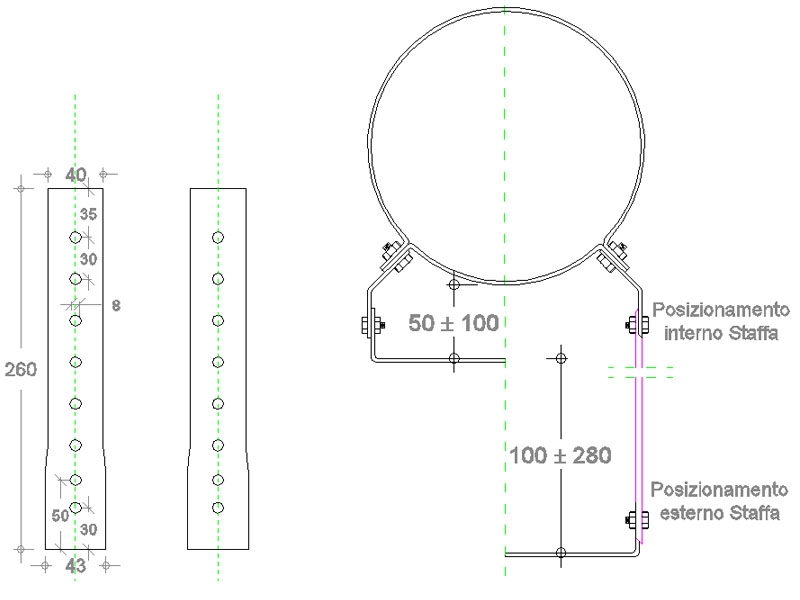 Per il corretto accoppiamento con il "COLLARE PESANTE" è importante che: l'estremità di larghezza mm 40 venga posizionata all'interno del corpo collare e successivamente imbullonata; l'estremità di larghezza mm 43 deve essere posizionata all'esterno del supporto di base del collare e successivamente imbullonata.