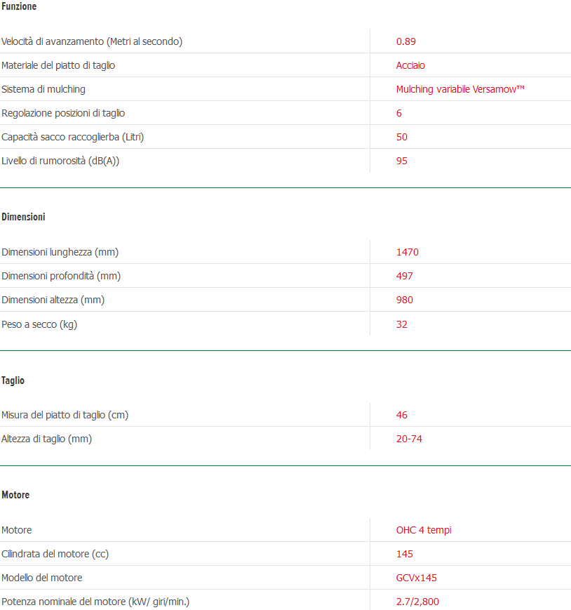 Può contare su un motore OHC a 4 tempi e un piatto di taglio da 46 cm e il sistema mulching selettivo Versamow™.