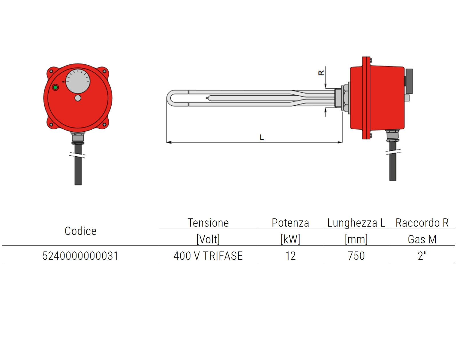 di termostato di regolazione, termostato di sicurezza a riarmo manuale e 2 mt di cavo elettrico cablato e senza spina. Range di utilizzo: 30 °C / 70 °C