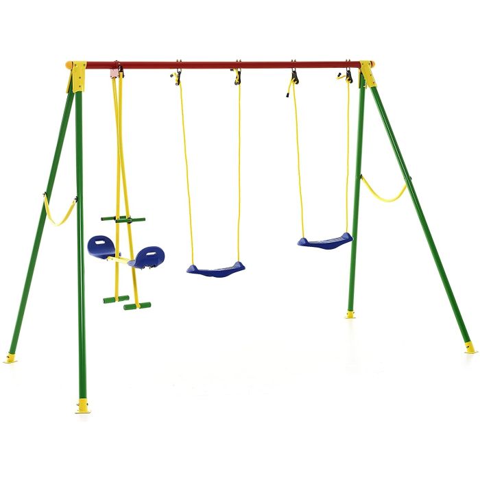 - Struttura in tubolare di acciaio spessore 50 mm., guarnizioni stabilizzanti con bullonatura in acciaio, 2 sediolini a tavoletta con corde portanti regolabili, 1 cavalluccio con 2 posti, gancio di sicurezza cavalluccio, piedini in acciaio antiribaltamento.