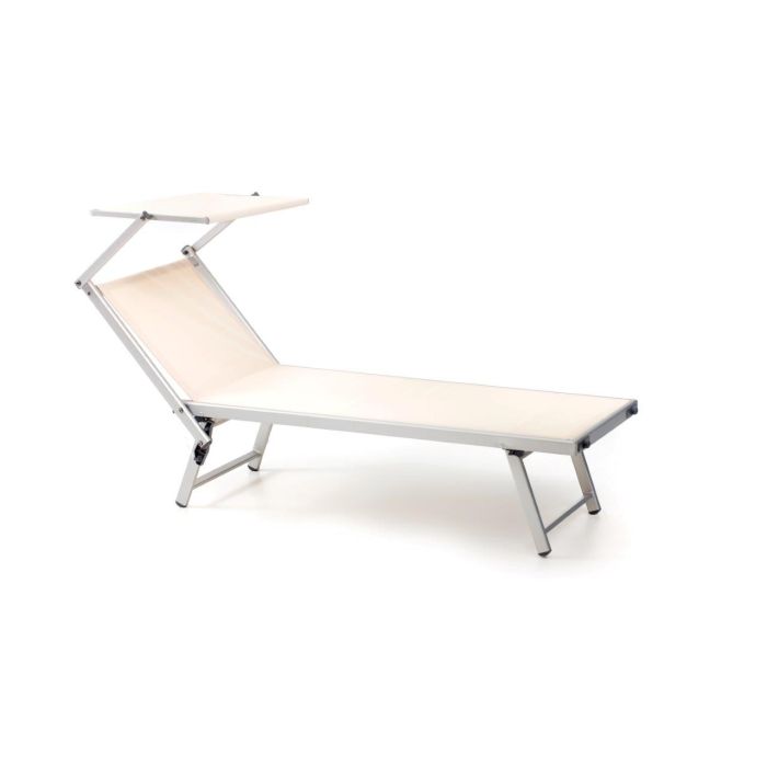 Lettino Prendisole Struttura in alluminio, schienale reclinabile in 2 posizioni, tettuccio parasole orientabile, telo in texitlene 750 g/m2 di colore ecrù, perni in acciaio inox, plastiche in nylon.