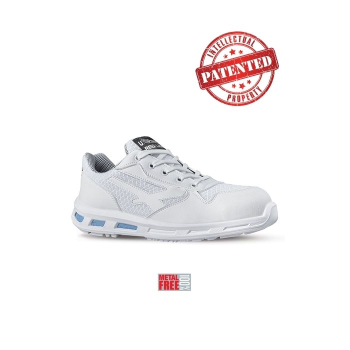 Scarpe antinfortunistiche bianche, totalmente "Metal free" basse, leggere e comode U-Power della linea Red Lion, con tomaia in nylon ultra traspiranti e microfibra Lucky, soffietto in nylon imbottito, puntale composite, antiscivolo e suola PU/PU infinergy, S1 SRC