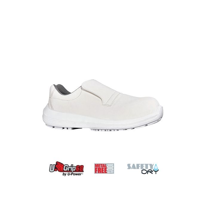 Scarpe antinfortunistiche bianche basse totalmente "no metal", comode e leggere U-Power della linea White68&Black, con tomaia New Safety Dry microfibra idrorepellente e traspirante, resistenti a batteri e residui organici chimici, facilmente lavabili, puntale AirToe Composite, antiscivolo e suola PU/PU U-Grip 68, S2 SRC