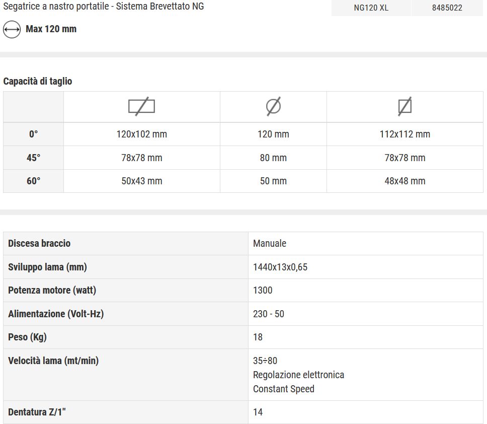 Descrizione / Sega a Nastro Portatile FEMI NG120 XL Segatrice Regolabile 120 mm