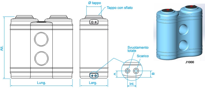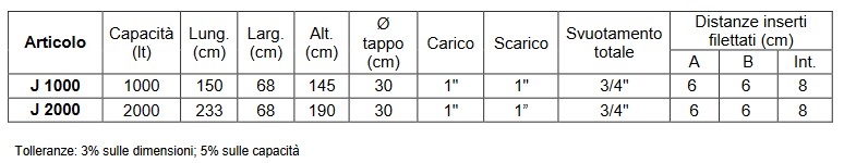 Materiale: serbatoi da esterno in monoblocco di polietilene lineare ad alta densità (LLDPE), dotati di tappo di ispezione a vite con sfiato e fori di scarico e svuotamento totale.