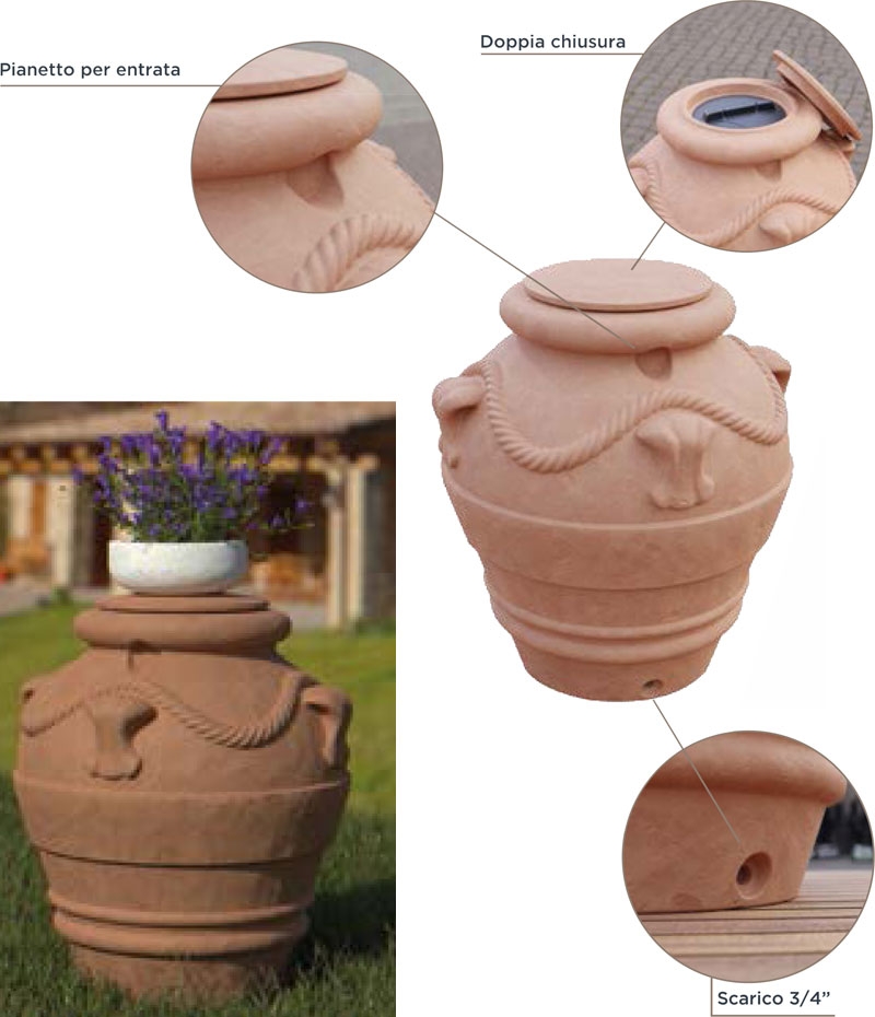 Coperchio piano con duplice funzione: chiusura del serbatoio e supporto per vaso. Predisposizioni filettate per il montaggio di raccordi e rubinetti.