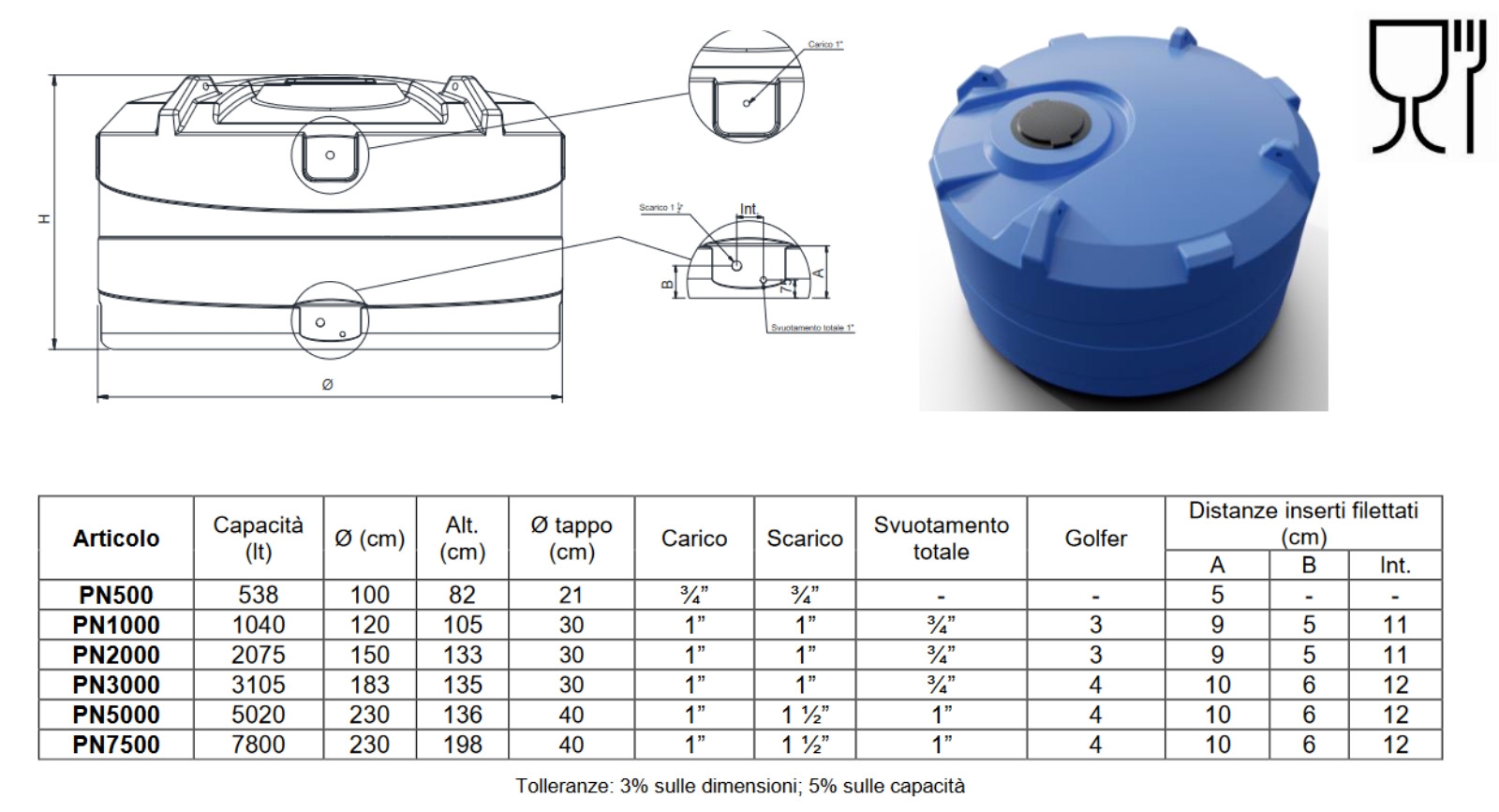 Materiale: serbatoi da esterno in monoblocco di polietilene lineare ad alta densità (LLDPE), dotati di tappo di ispezione a vite con sfiato e fori di scarico e svuotamento totale.