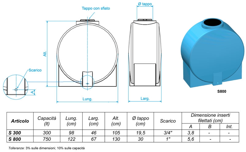 Materiale: serbatoi da esterno in monoblocco di polietilene lineare ad alt a densità (LLDPE), dotati di tappo di ispezione