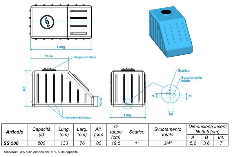Materiale: serbatoio da esterno in monoblocco di polietilene lineare ad alta densità (LLDPE), dotato di tappo di ispezione