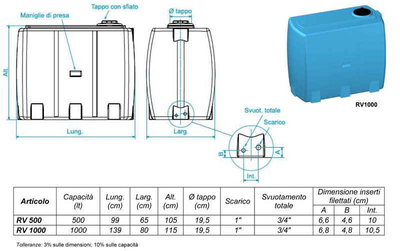 Materiale: serbatoi da esterno in monoblocco di polietilene lineare ad alta densità (LLDPE), dotati di tappo di ispezione a vite con sfiato e fori di scarico e svuotamento totale. Funzione: contenitori utilizzati per lo stoccaggio di acque potabili e meteoriche ed altri liquidi alimentari. L’elevata resistenza e la bassa reattività del polietilene lineare ad alta densità permette l’utilizzo dei serbatoi per il contenimento di diverse tipologie di fluidi (vedere la scheda di compatibilità del PE ai fluidi).