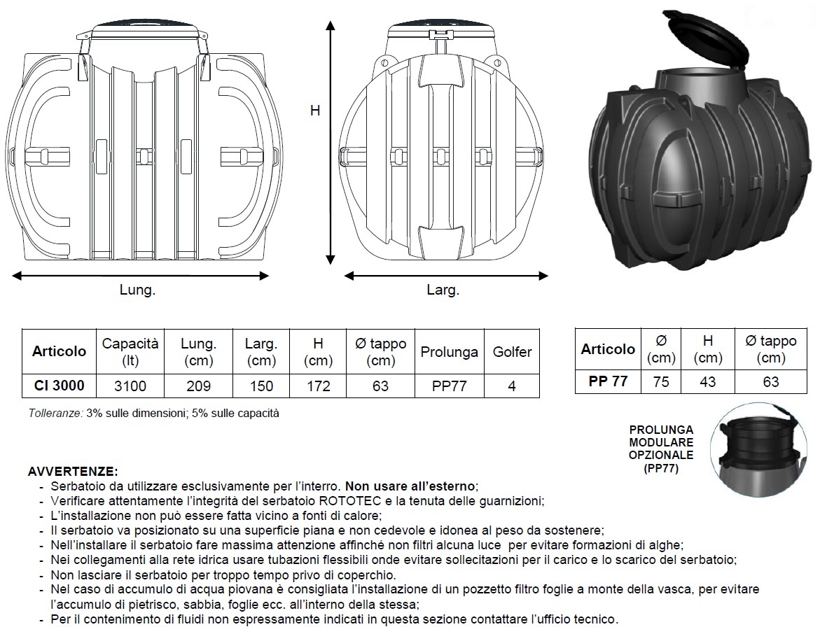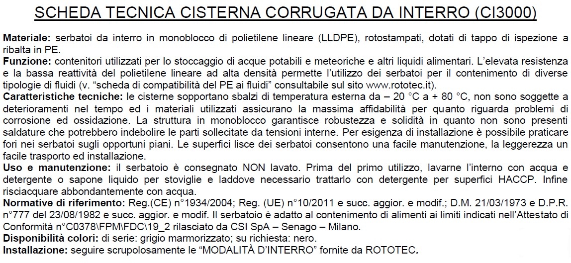 Descrizione / Serbatoio Acqua da Interro Corrugati ROTOTEC CISTERNA CI3000 Litri 3100