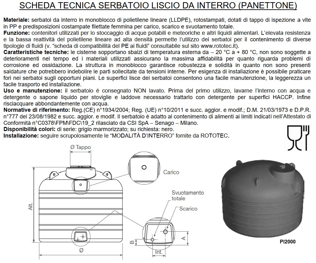 Descrizione / Serbatoio Acqua da Interro Lisci ROTOTEC PANETTONE PI2000 Litri 2075