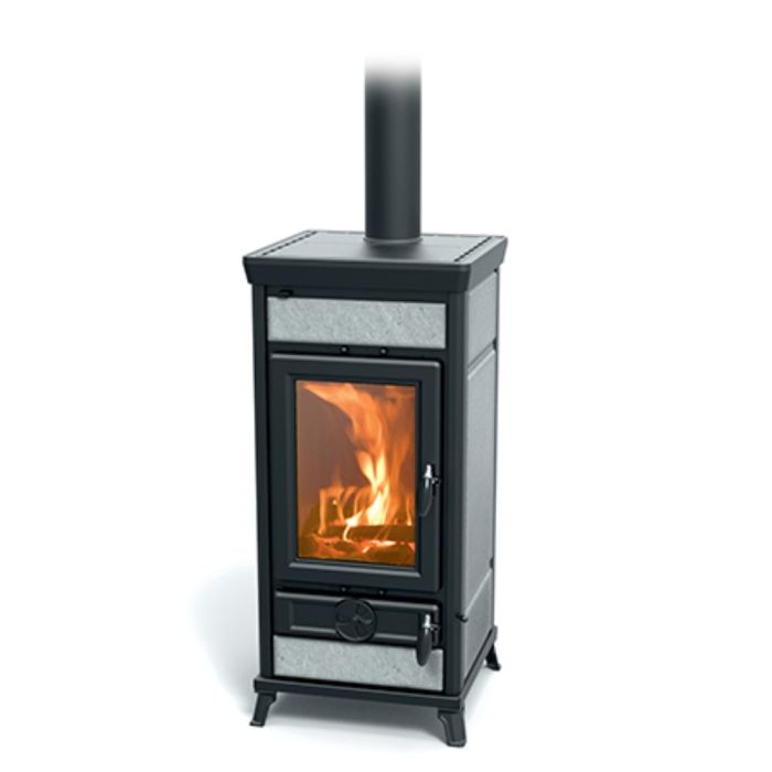 Stufa a legna costruita in acciaio e ghisa con grande superficie di scambio e lunghi percorsi obbligati dei fumi, dotata di uno speciale scambiatore in acciaio inox, camera di combustione in ghisa, comandi per la regolazione dell’aria primaria e secondaria e terziaria, maniglie ergonomiche, scuoti griglia, porta in ghisa smaltata con vetro ceramico resistente a 750°, finitura superiore in ghisa smaltata, cassetto cenere estraibile. Rivestimento esterno in pregiata pietra ollare e ghisa. Tecnologia Smoke by-pass, attivando il dispositivo si riduce drasticamente la fuoriuscita di fumo nell’ambiente ad ogni carica di legna.