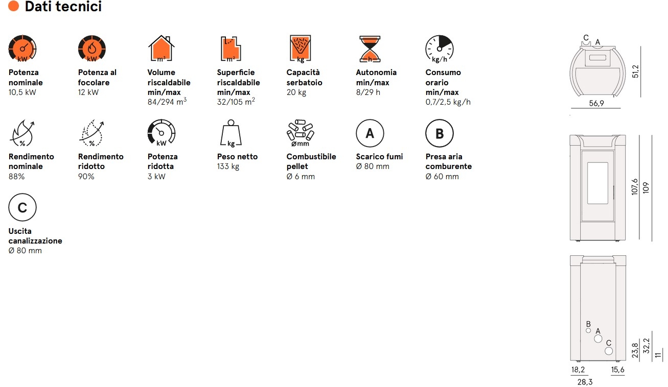 Descrizione / Stufa a Pellet Ad Aria Canalizzabile 10,5 Kw CADEL FENICE PLUS 11 Diverse Colorazioni