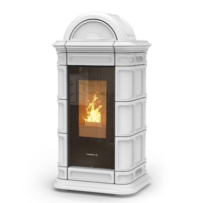 La stufa a pellet, con piano scaldavivande in cristallo, igienico e di facile pulizia (Coperchio scaldavivande “Dinner” – optional), capacità serbatoio 19 kg, dotata di un esclusivo sistema di accesso al serbatoio attraverso lo scorrimento del coperchio in cristallo nero, piano salva cenere in maiolica. Termostato di sicurezza, pannello digitale LCD, crono settimanale con tre programmazioni giornaliere indipendenti e di facile utilizzo, pressostato meccanico di sicurezza, porta in ghisa, bruciatore in ghisa pesante e di