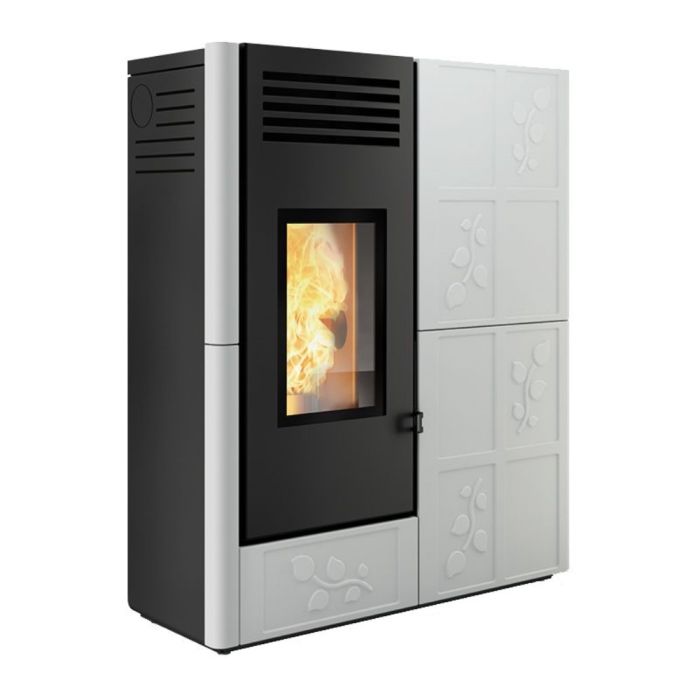 Folia ha un design classico e, allo stesso, contemporaneo. Il rivestimento in maiolica incornicia la struttura e presenta un delicato decoro con foglie in rilievo. La porta è in acciaio, il grande vetro è serigrafato ed enfatizza la fiamma. Il rivestimento in maiolica di Folia è disponibile in tre colori: bianco, beige, bordeaux lucido.