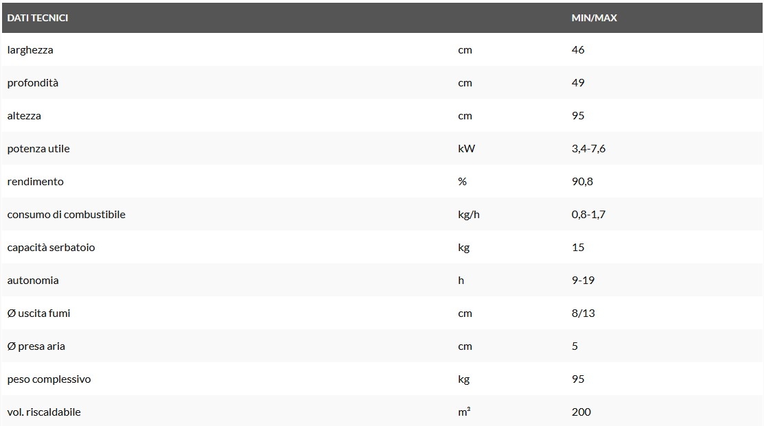 Stufa a pellet stagna dal moderno design squadrato e lineare, senza griglie sul frontale, con porta e fianchi in acciaio. Il corpo della stufa, leggermente più alto dei fianchi, crea un particolare gioco di geometrie.
