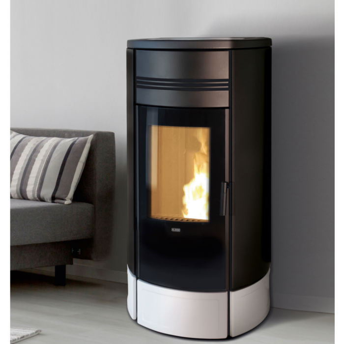 Termostufa a pellet con porta curva con doppio vetro.