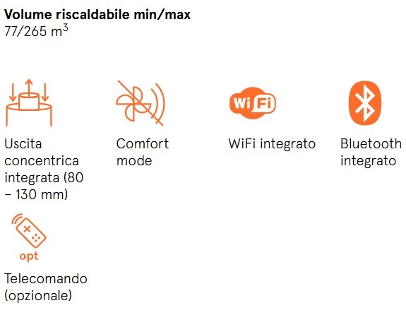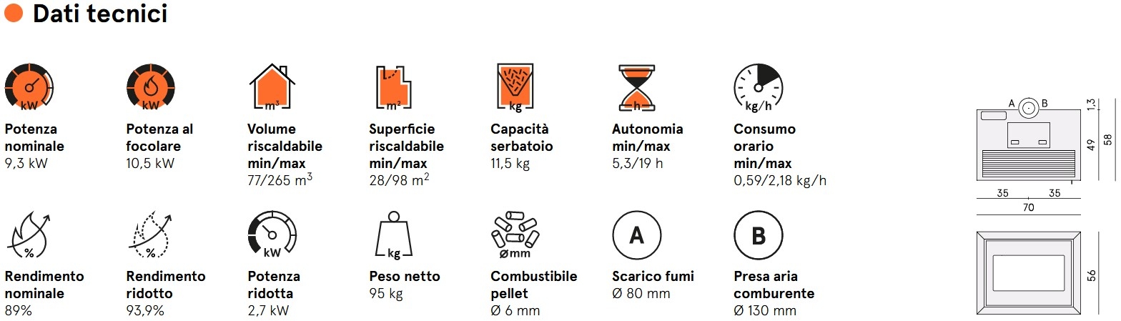 Focolare interamente in ghisa, potenza di 9 kW per soddisfare spazi più ampi e uscita fumi superiore.