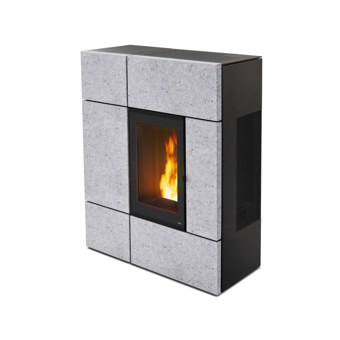 Stufa a pellet in pietra o acciaio, canalizzata, design essenziale