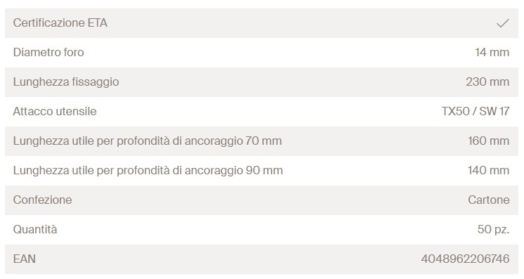 Approvazione ETA: permette l'utilizzo su numerosi materiali edili, garantendo al tempo stesso un fissaggio sicuro.