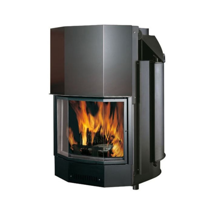 Termocamino in acciaio di forte spessore, in grado di alimentare l'impianto di riscaldamento a termosifoni ed il circuito dell'acqua calda sanitaria. Dotato di portellone scorrevole con frontale prismatico. Posizionabile a parete o ad angolo.