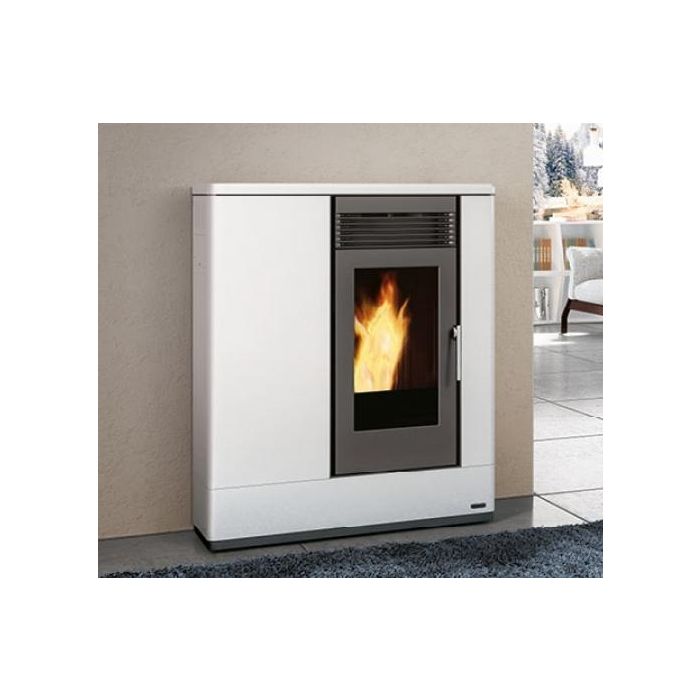 Stufa Thermo a pellet con rivestimento in acciaio verniciato e piano superiore in Maiolica.