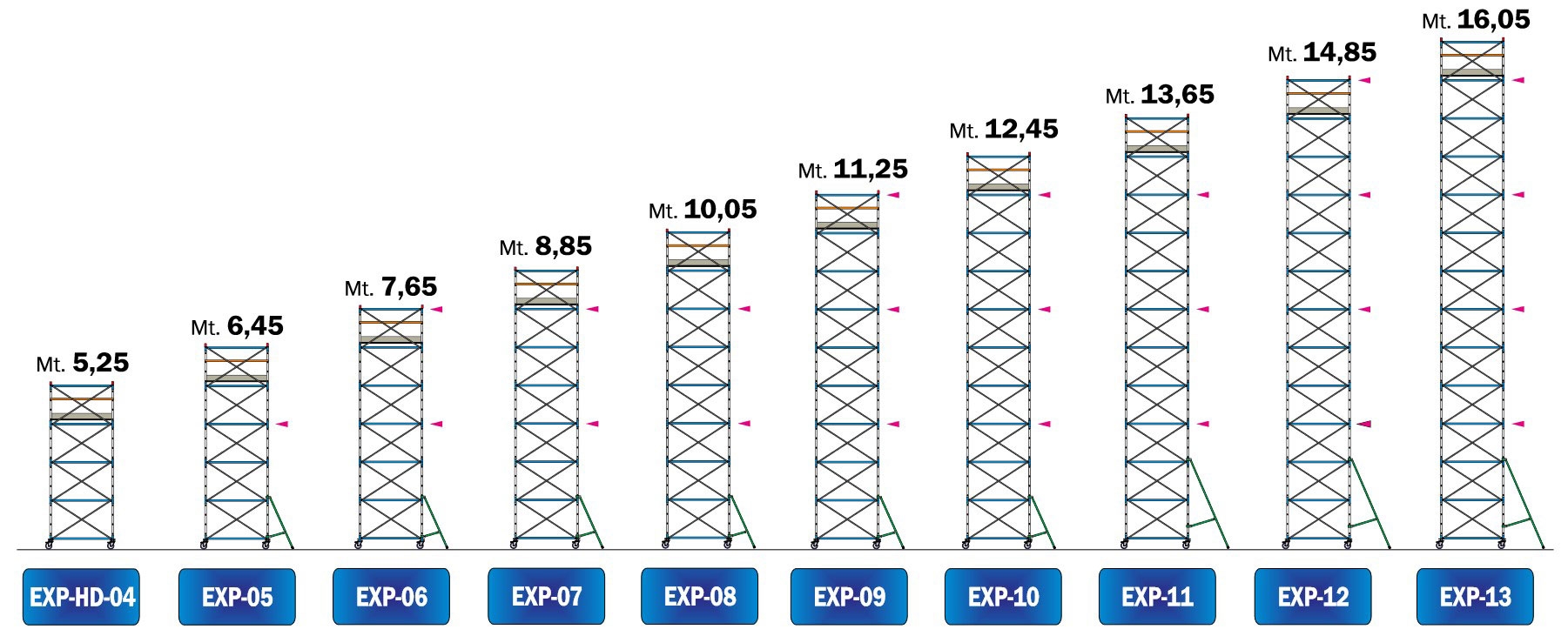 - Gradini in profilo rettangolare mm 40 x 20 con profonda rigatura anti-scivolo distanziati ogni 30 cm consentono di utilizzare ogni montante come una vera scala verticale e di posizionare i piani di lavoro e i parapetti intermedi con grande facilità.