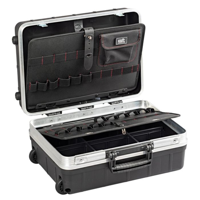 Il sistema trolley integrato, composto da ruote con cuscinetti a sfera e maniglione telescopico, consente uno spostamento fluido anche a pieno carico. La struttura è rinforzata con profili in alluminio e cerniere metalliche, pensata per durare nel tempo anche in ambienti di lavoro intensi.
