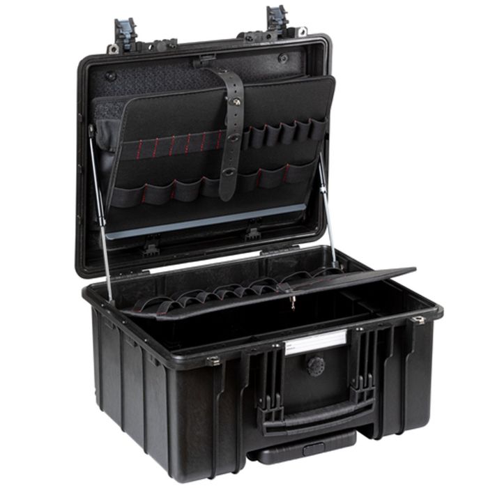 All’interno, la configurazione PEL prevede due pannelli porta-utensili con fasce elastiche, pensati per mantenere ordinatamente in posizione utensili manuali, strumenti di misura e piccoli accessori. Questa organizzazione interna è ideale per professionisti che necessitano di avere tutto a portata di mano in modo rapido ed efficiente.